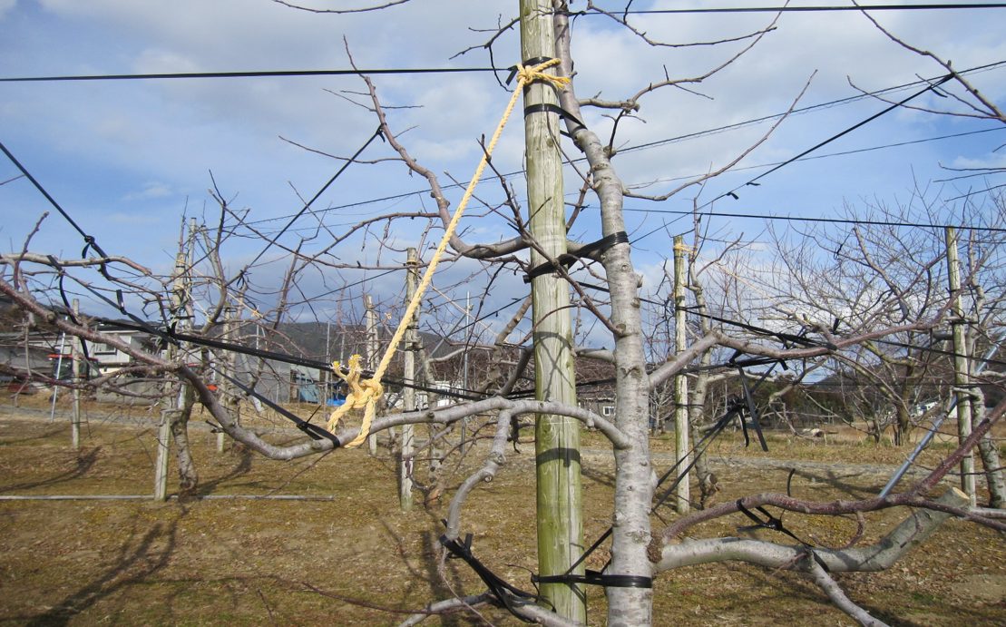 剪定作業 2024.03.30 りんごを収穫しりんご畑全体の剪定作業を12月~2月にかけてを行いました。 作業内容は、震災後に植えた木が暴風に耐えられるようにワイヤーを張り、枝折れ防止用にロープで固定作業を実施。 写真は、選定作業完了後のリンゴ畑です。 Tweet ふじりんご100%ストレートジュース 植替え作業
